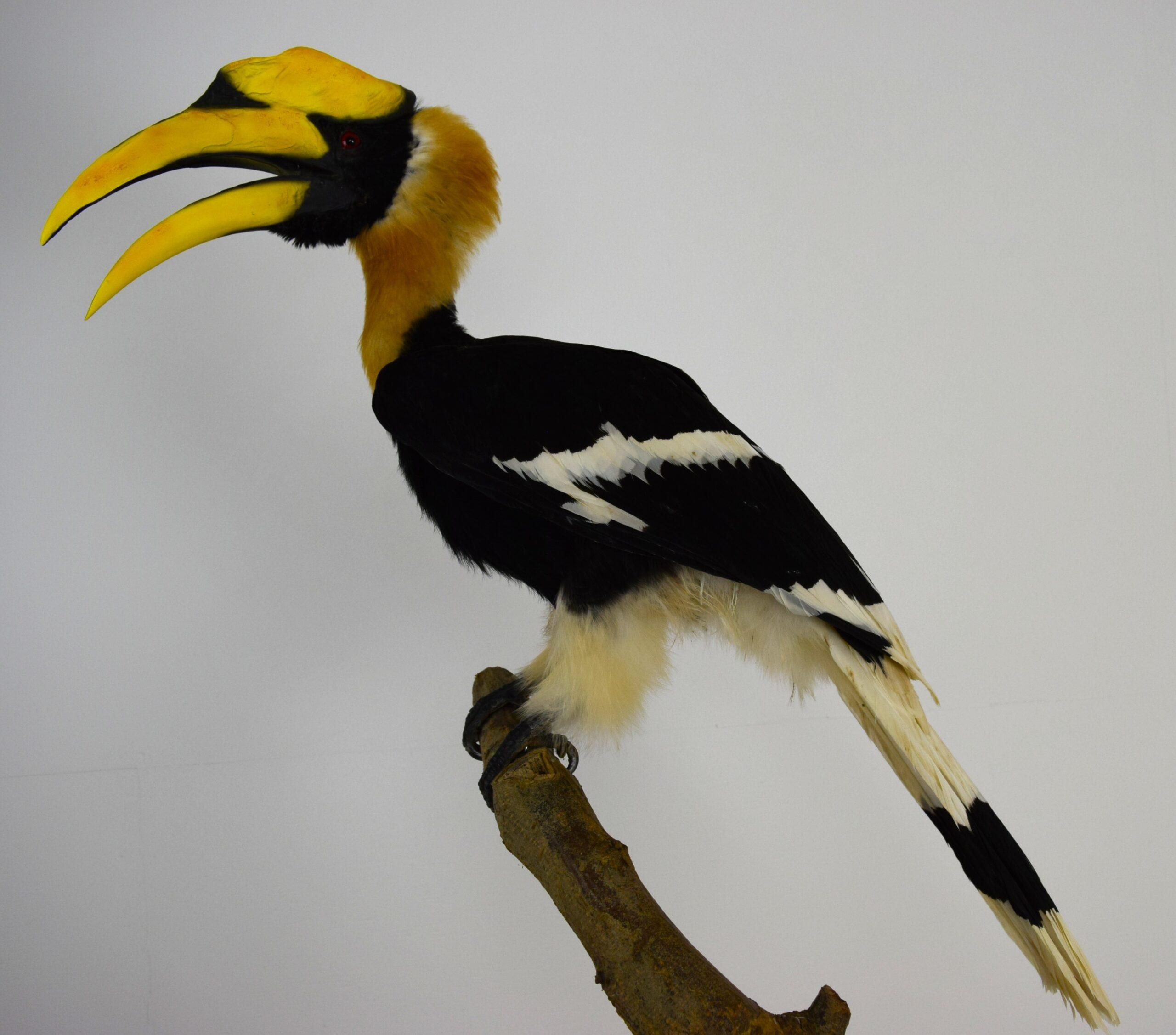 Taxidermy of a Great Hornbill, male, mounted on a log